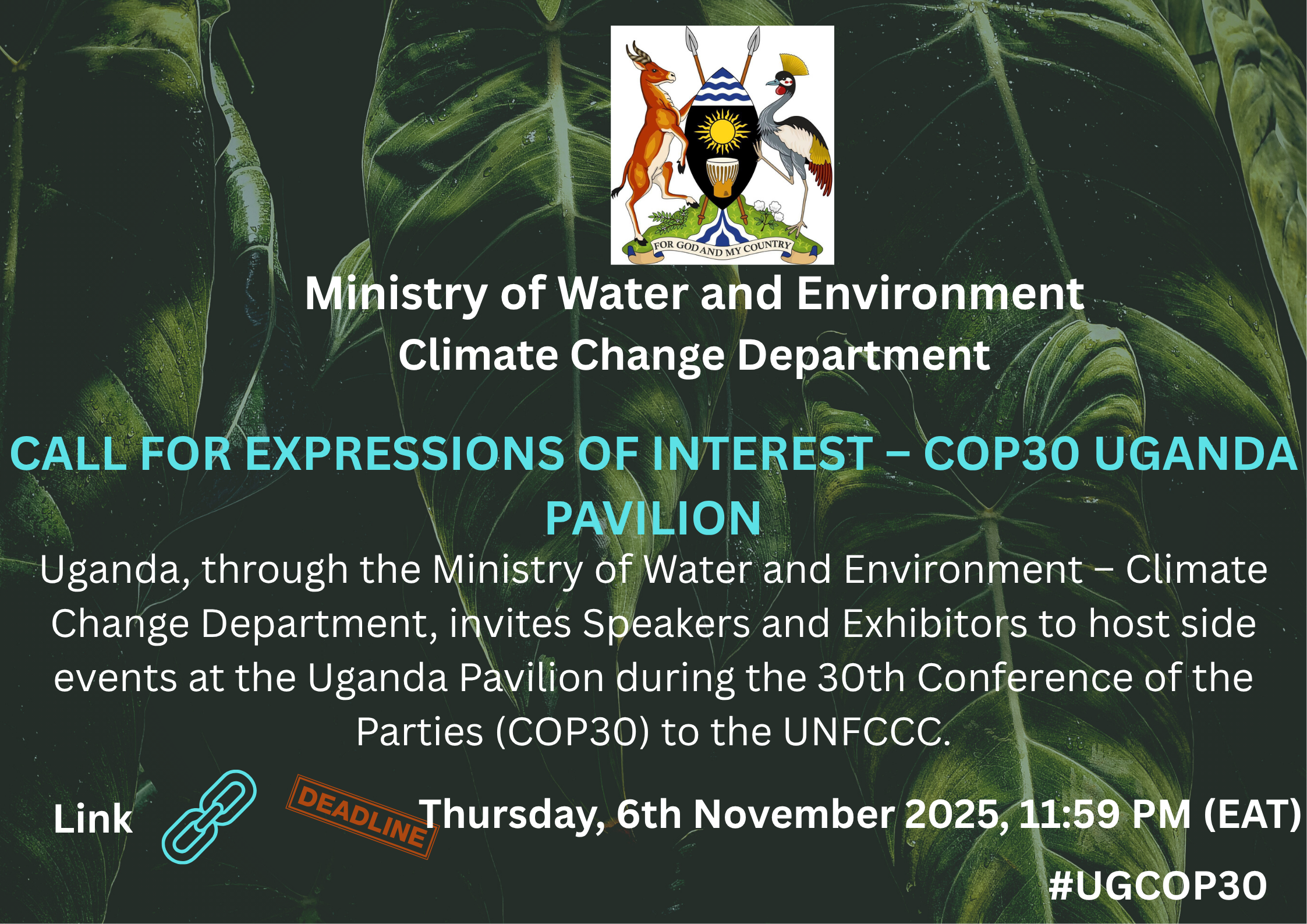 The Ministry of Water and Environment, through the Climate Change Department, invites Speakers and Exhibitors to host side events at the Uganda Pavilion during the 30th Conference of the Parties (COP30) to the UNFCCC in Belém, Brazil (10–21 November 2025).