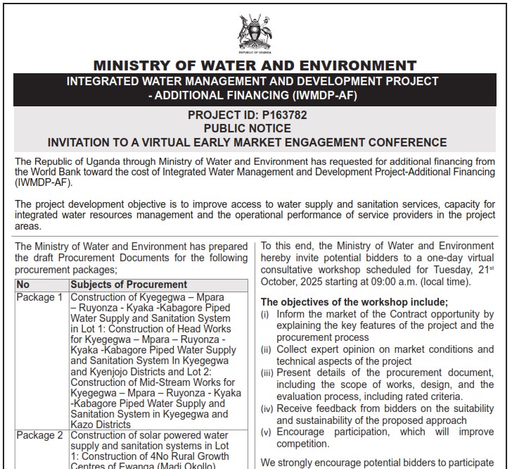 The Republic of Uganda through Ministry of Water and Environment has requested for additional financing from the World Bank toward the cost of Integrated Water Management and Development Project-Additional Financing (IWMDP-AF). The project development objective is to improve access to water supply and sanitation services, capacity for integrated water resources management and the operational performance of service providers in the project areas.